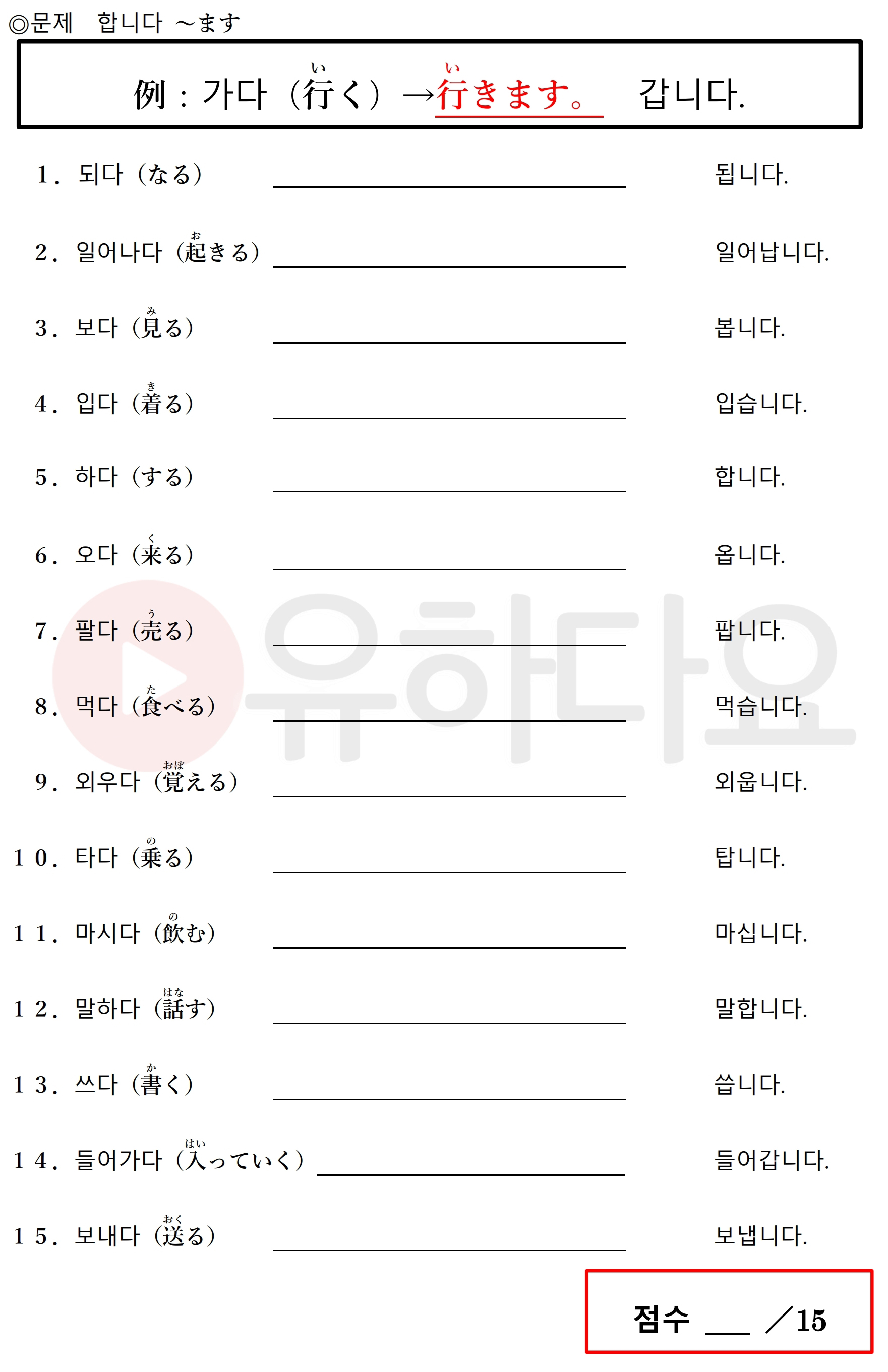 うります。8.たべます。9.おぼえます。10.のります。11.のみます。12.