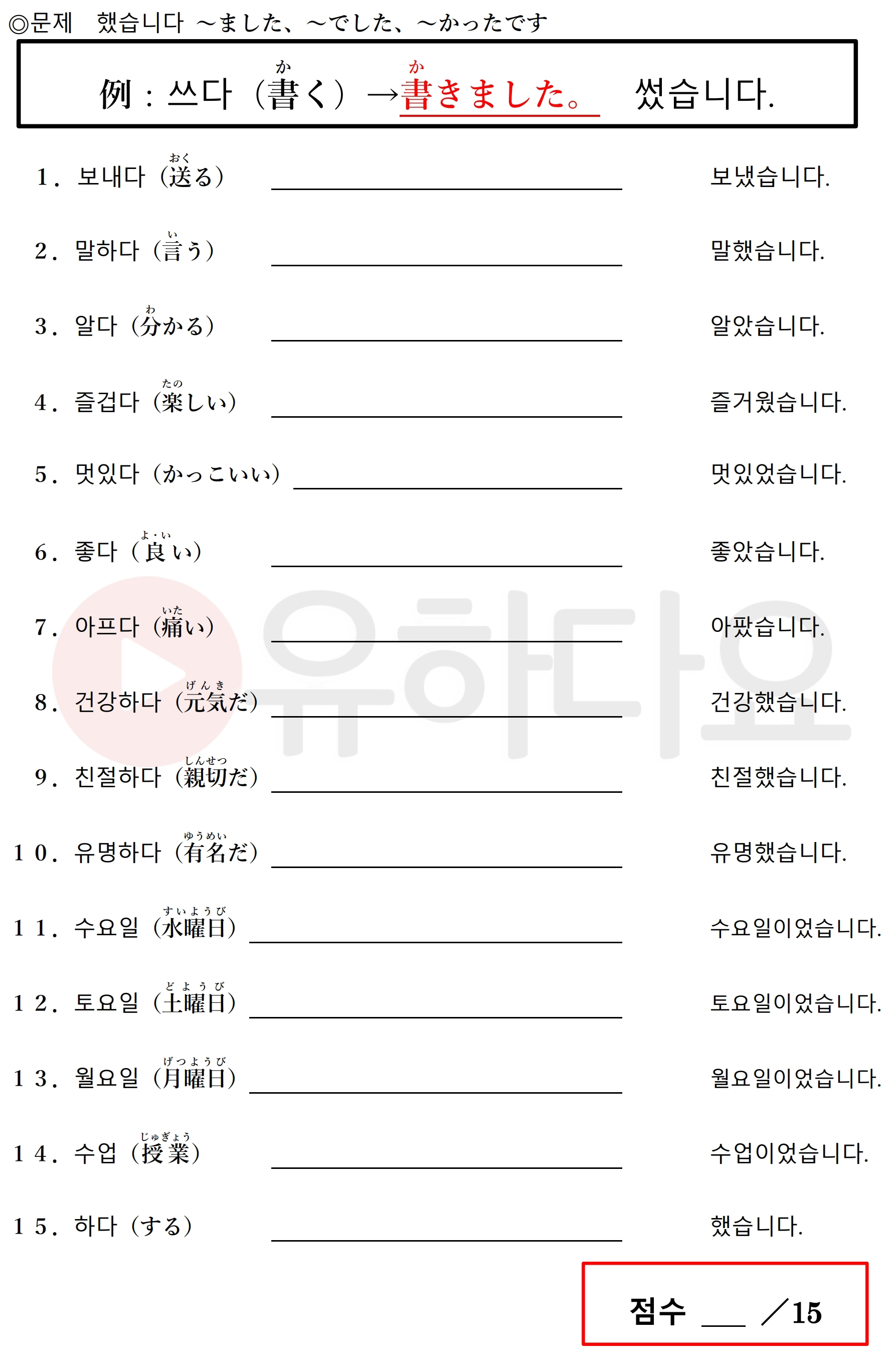 した。13.げつようびでした。14.じゅぎょうでした。15.しました。