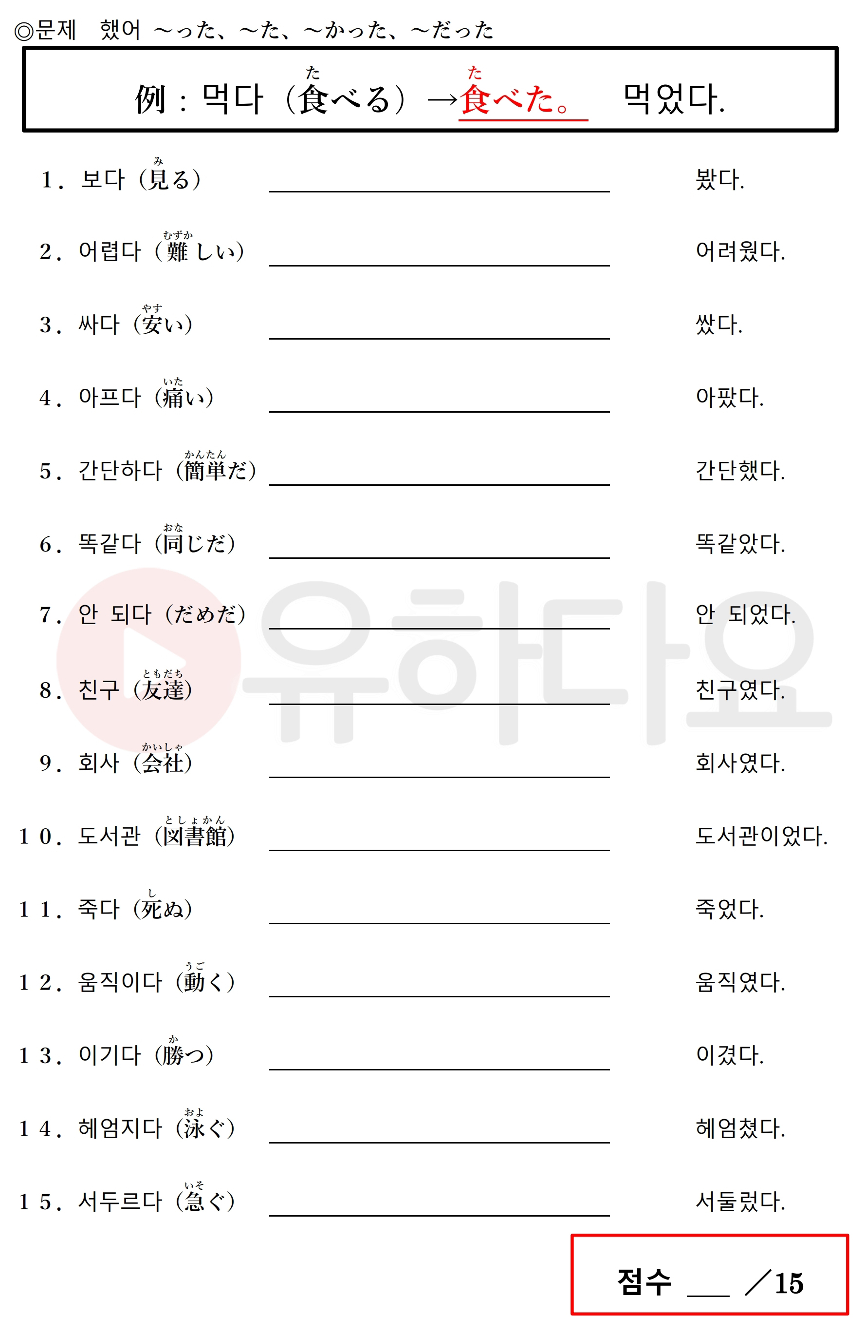 1.みた。2.むずかしかった。3.やすかった。4.いたかった。5.かんたんだっ