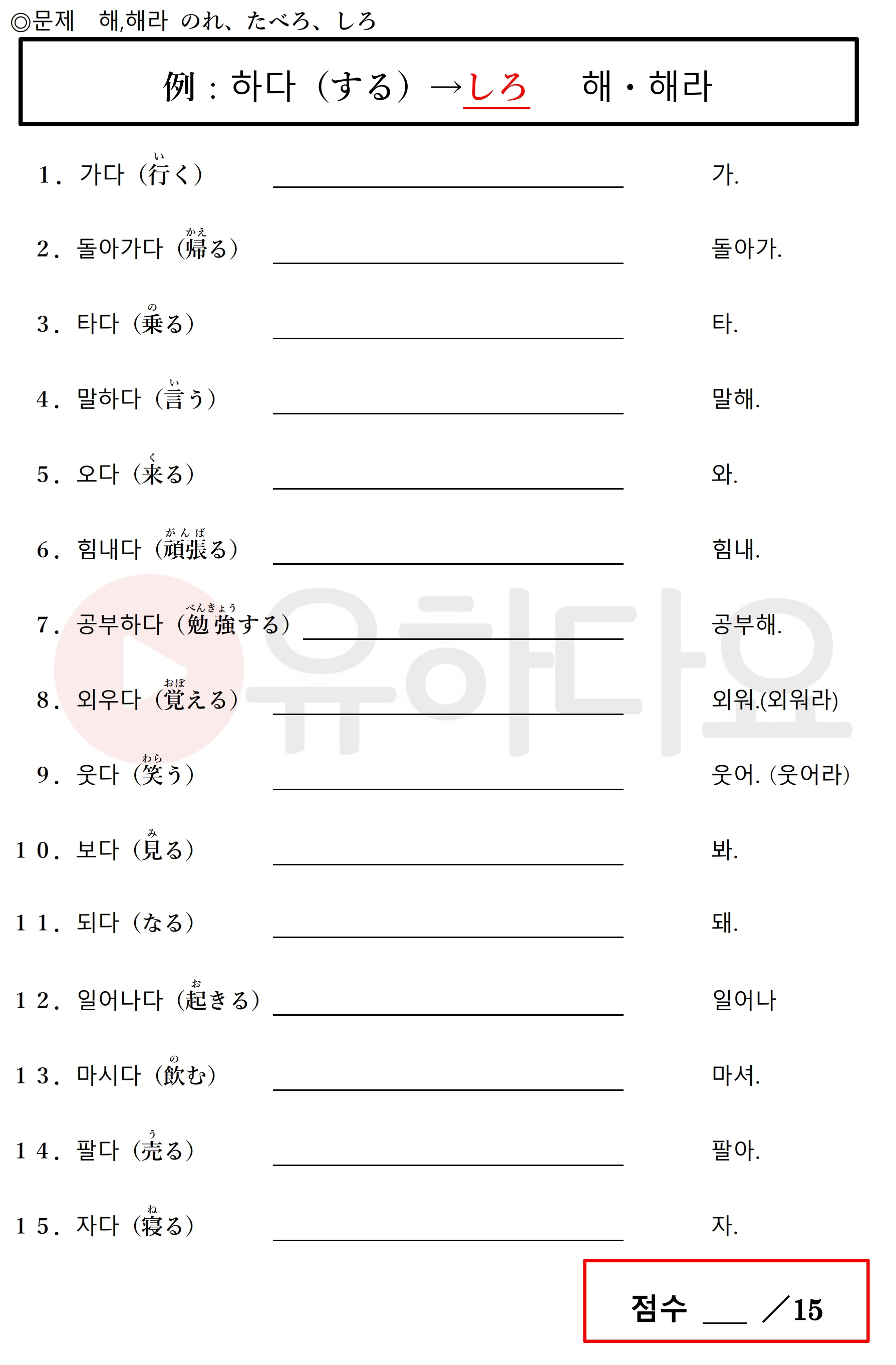 1.いけ。2.かえれ。3.のれ。4.いえ。5.こい。6.がんばれ。7.べんきょ