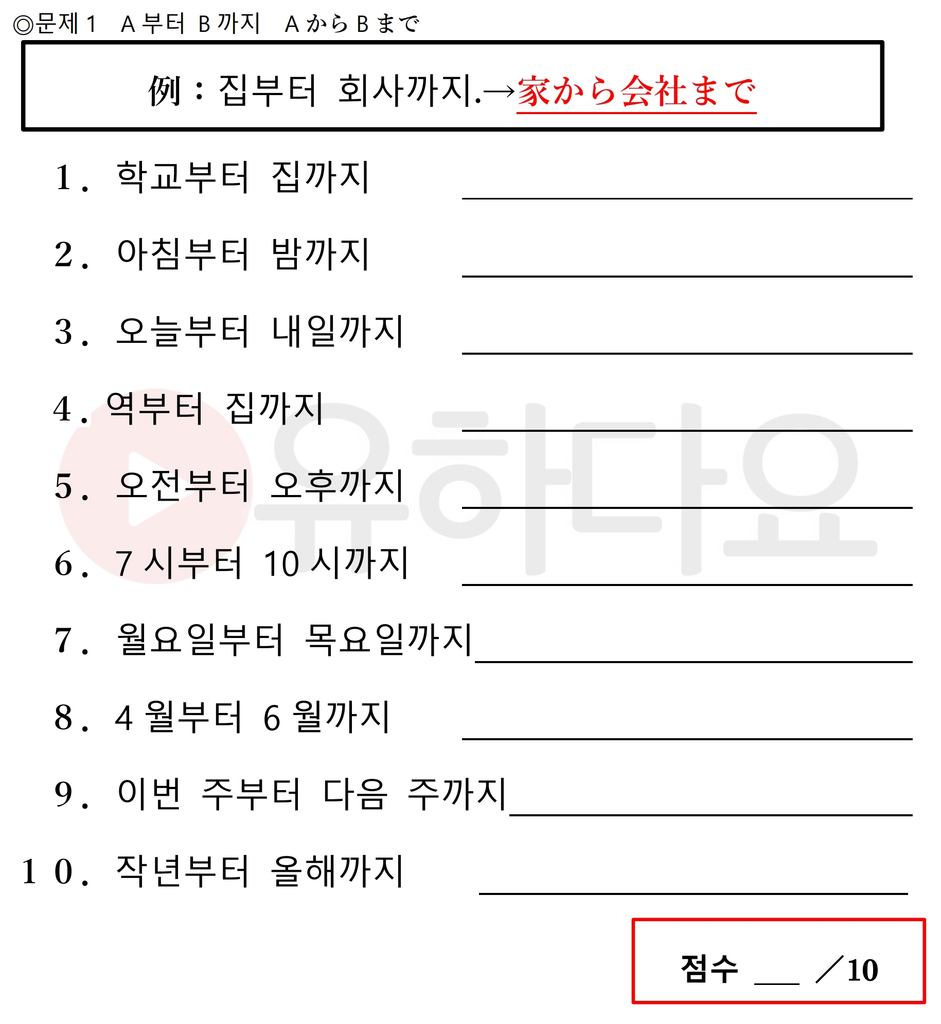 1.がっこうからいえまで。2.あさからよるまで。3.きょうからあす(あした)ま