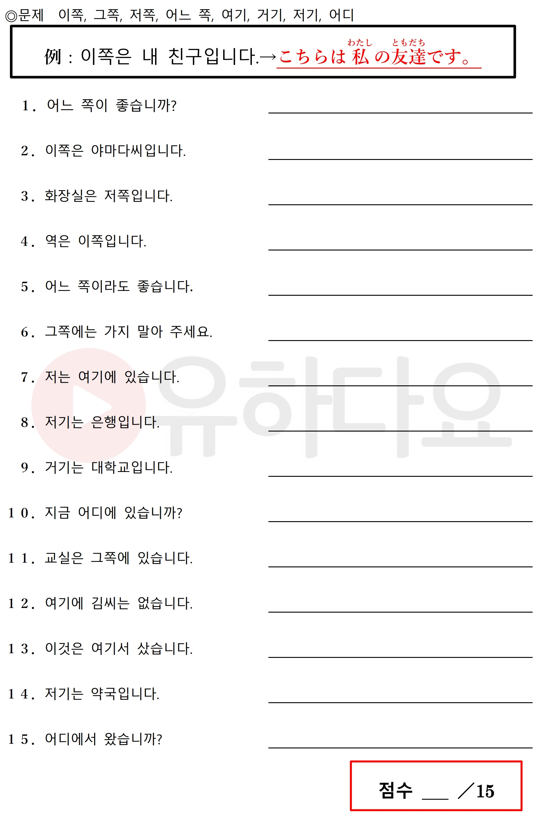 8.あそこはぎんこうです(あちらはぎんこうです)9.そこはだいがくです。10.いま