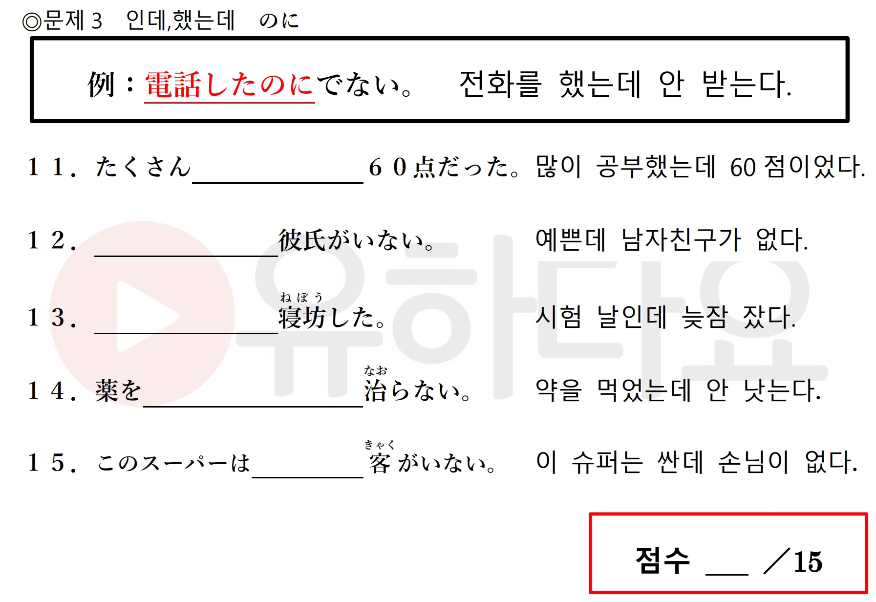 じんなので9.やすいので10.しけんなので11.べんきょうしたのに12.きれい