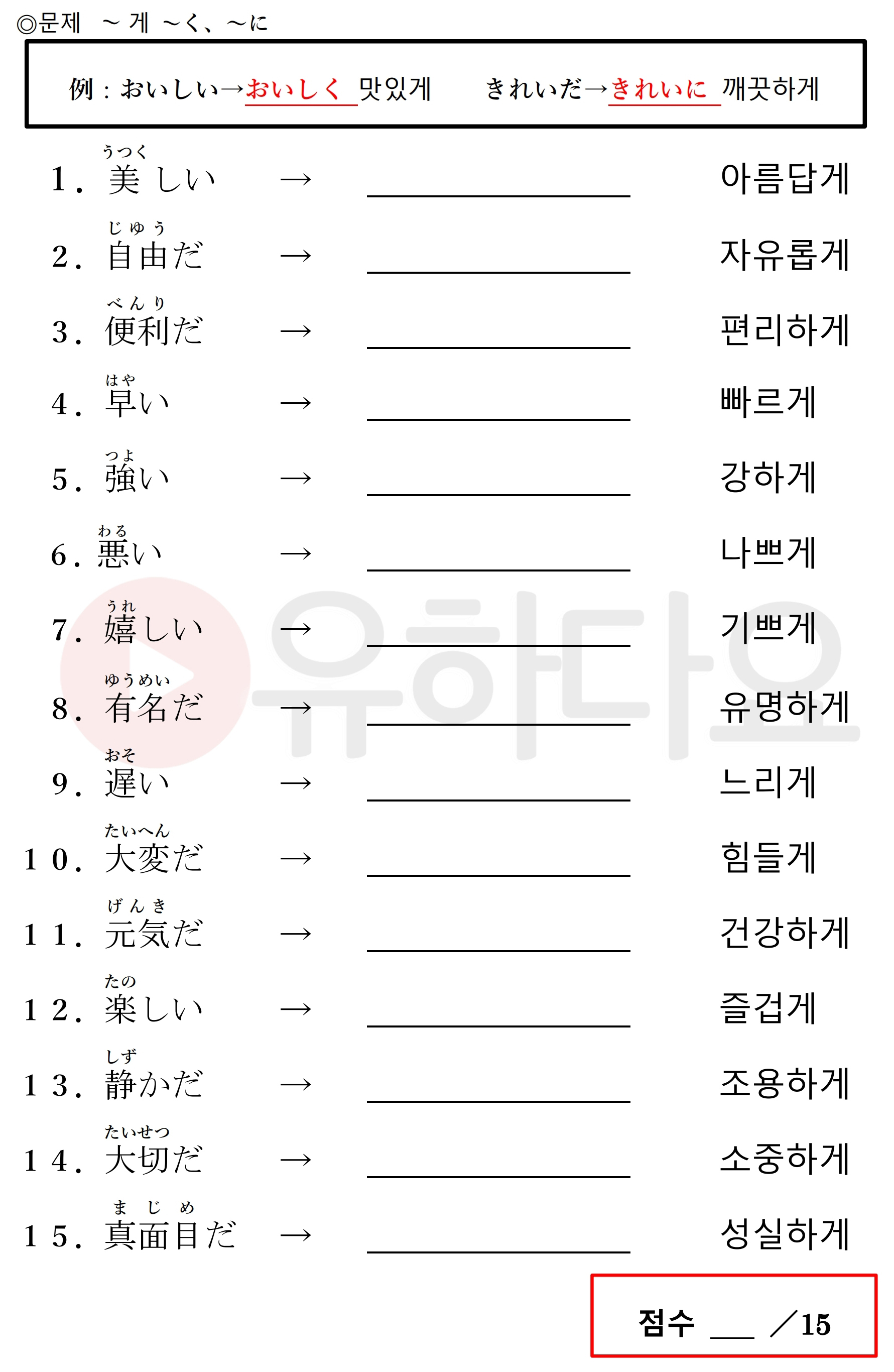 1.うつくしく2.じゆうに3.べんりに4.はやく5.つよく6.わるく7.うれし