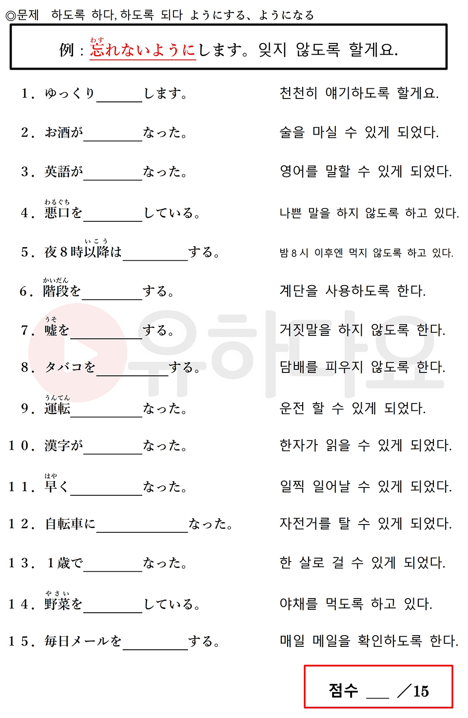 1.はなすように2.のめるように3.はなせるように4.いわないように5.たべな